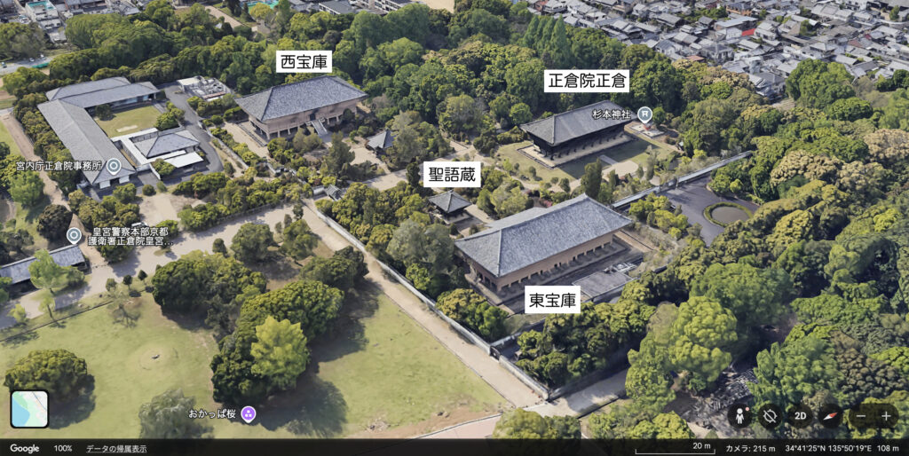 さらにいうと、正倉院の正倉(奈良時代に建造された本来の宝物庫)の他に、近代技術での保存を行うために昭和期に新たに建てられた「東宝庫」「西宝庫」と「聖語蔵」(13世紀中頃に建造され、明治時代に現地に移築された東大寺の経典を納めた倉庫)の外構も見ることができます。