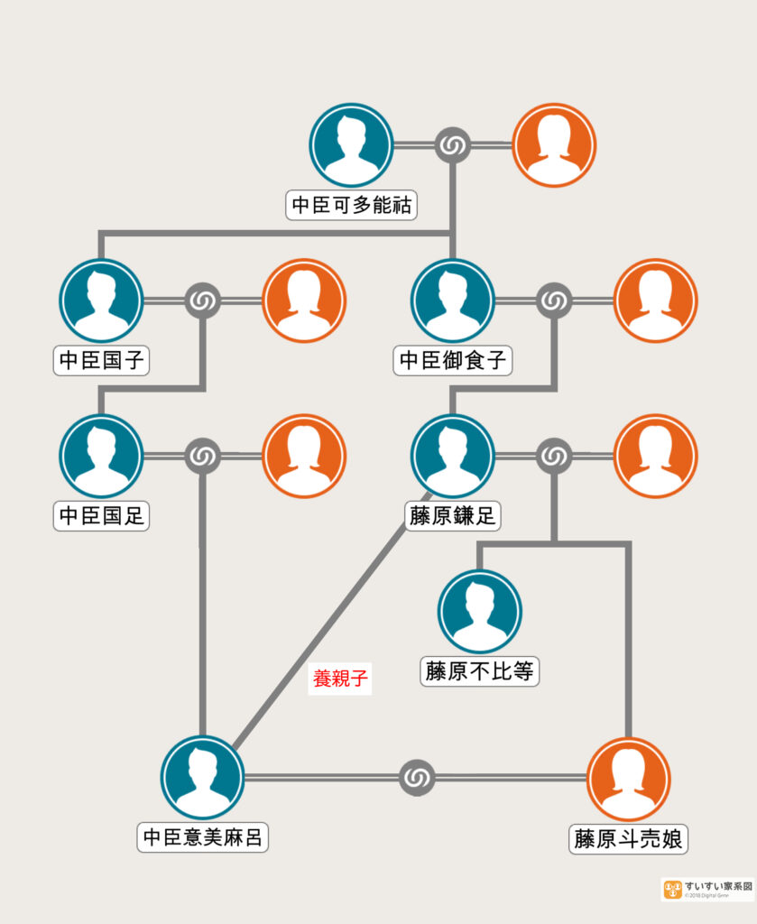 祖父の世代で同じ親を持つ中臣意美麻呂と藤原不比等は血縁上「はとこ」の関係にある