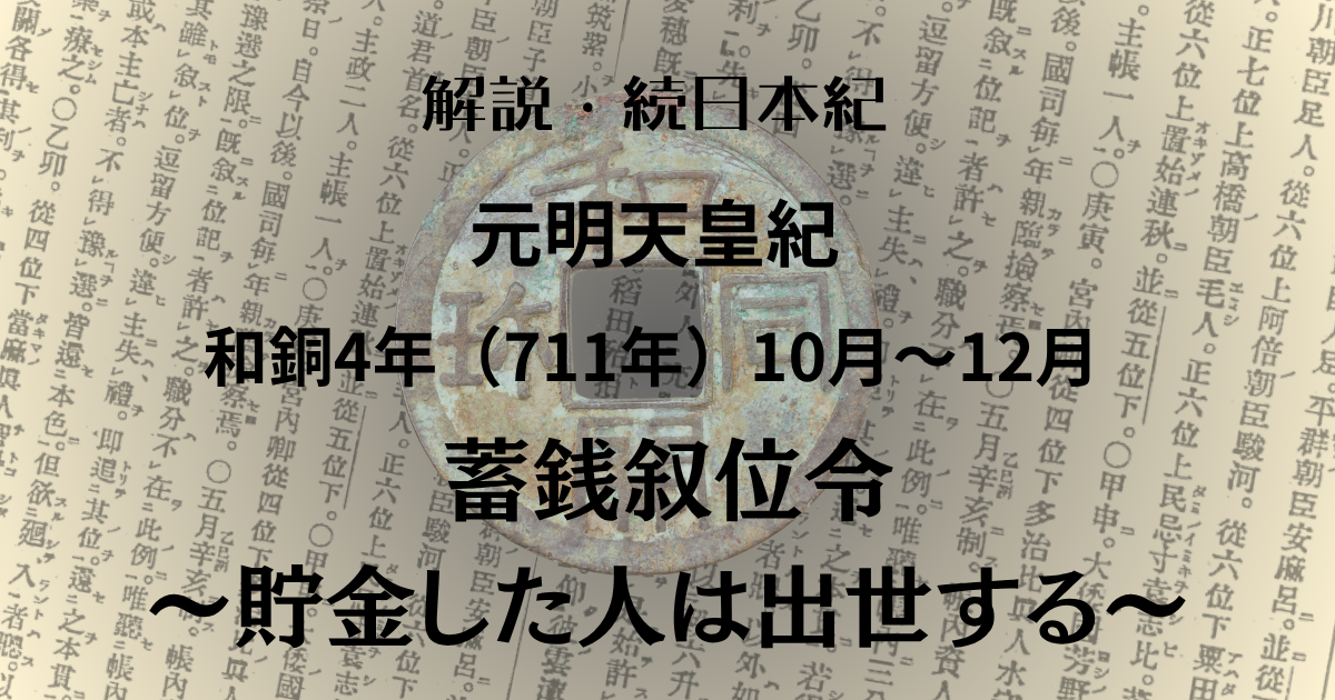 これはいわゆる「蓄銭叙位令」で、主に従六位以下の位階を持つ官人(同年12月20日条において、無位と白丁に範囲拡大)に銭(和同開珎)を蓄えさせることで、貨幣経済の普及を狙った政策です。なお『続日本紀』においては「蓄銭叙位之法」と表記されています。