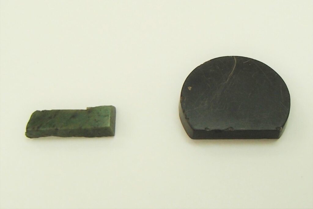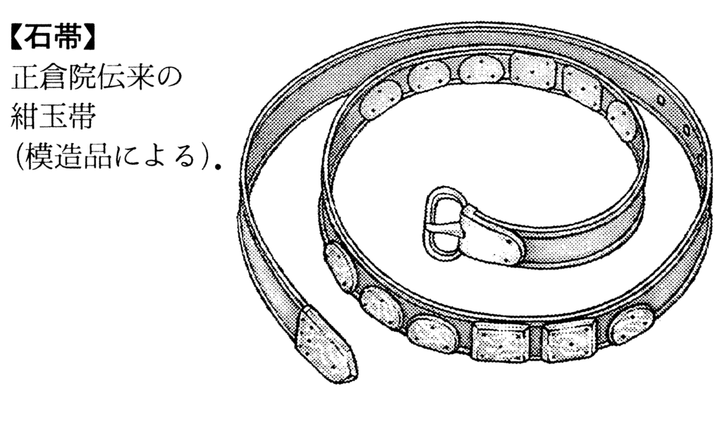 上のイラストに、□や◯の形の物がついていますね。五位以上は、これに金銀を用いて飾り、六位以下は銅に黒漆を塗ったものを使用することが決まりでした。のちの時代には、金属ではなく石が使用され「石帯」と呼ばれるようになりました。